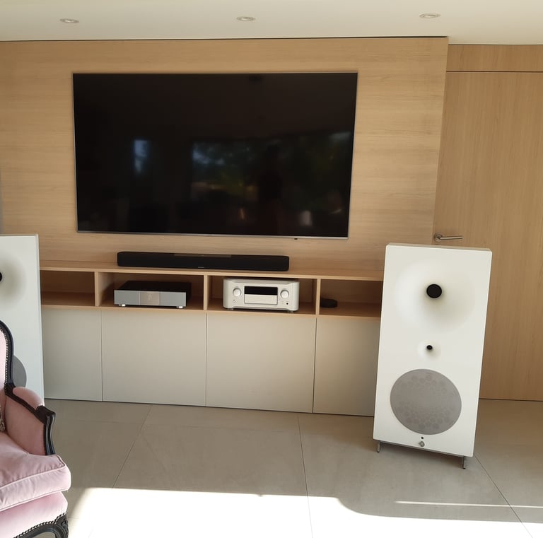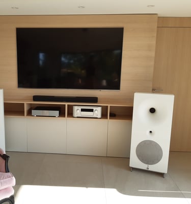 Un meuble télé sur mesure effet "suspendu" avec cloison claustra et câblage caché.